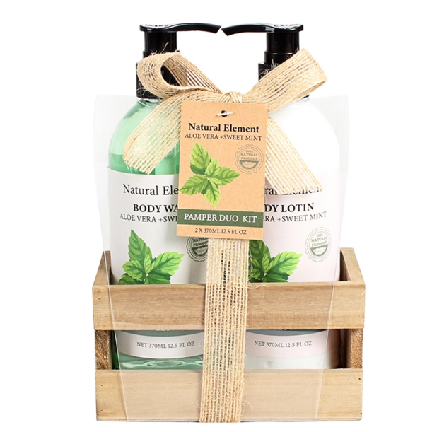 The 370ml bottles offer ample product for extended use, while the wooden tray doubles as a decorative storage piece, adding functionality that enhances customer satisfaction and repeat purchases.