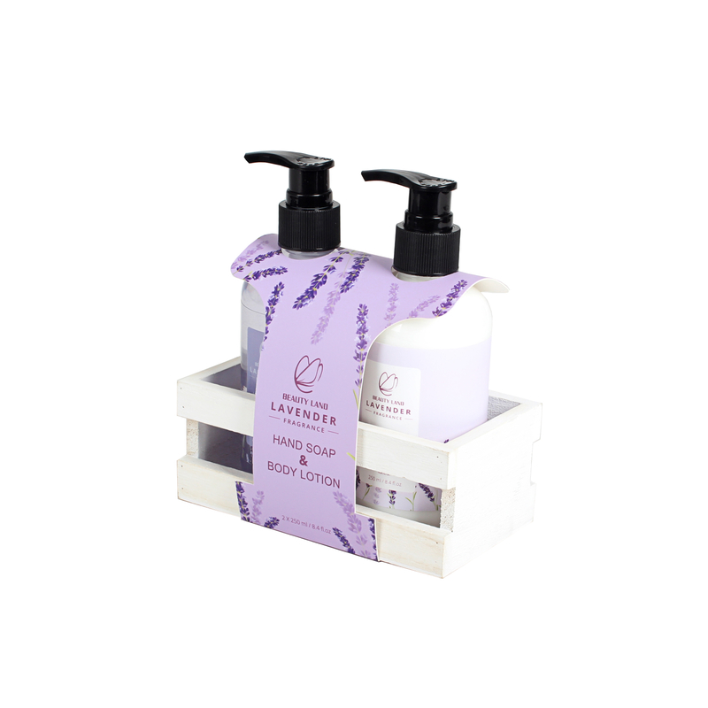 Contents | - 250ml hand soap in bottle + black pump + wrap label - 250ml body lotion in bottle + black pump + wrap label - Wooden tray + paper locker |