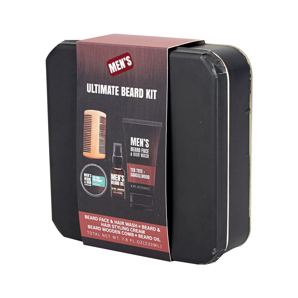 | Contents | 150ml beard face & hair wash in tube+ black cap, 10ml beard oil in bottle+ black sprayer, 30ml beard & hair styling cream in aluminum can, Wooden comb, Tin box with clip+ wrapped bellyband. |