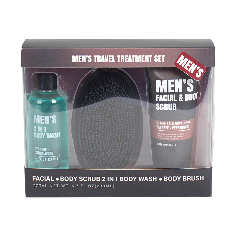 | Contents | 180ml body wash in bottle+ black cap, 100g facial body scrub in in tube+ black cap, Silicone shampoo brush, Paper box |