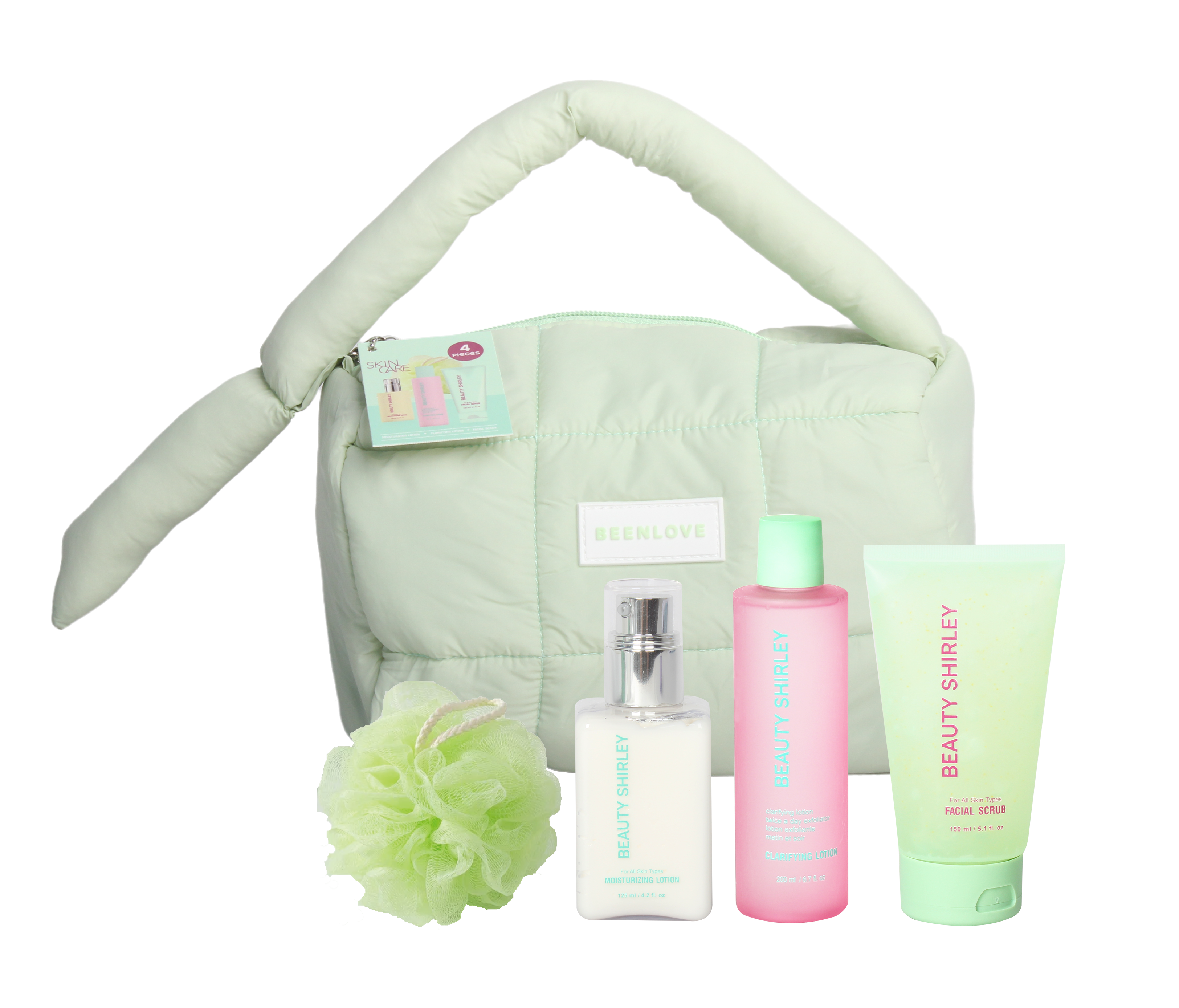 Contents | - 125ml Moisturing Lotion glossy bottle + silver pump + clear cap, - 200ml Clarifying Lotion in Matte plastic bottle + matte cap, - 150ml Facial Scrub in Soft Touch tube + Matte cap, - 20g Mesh Sponge, - Cosmetics Bag + paper band. |
