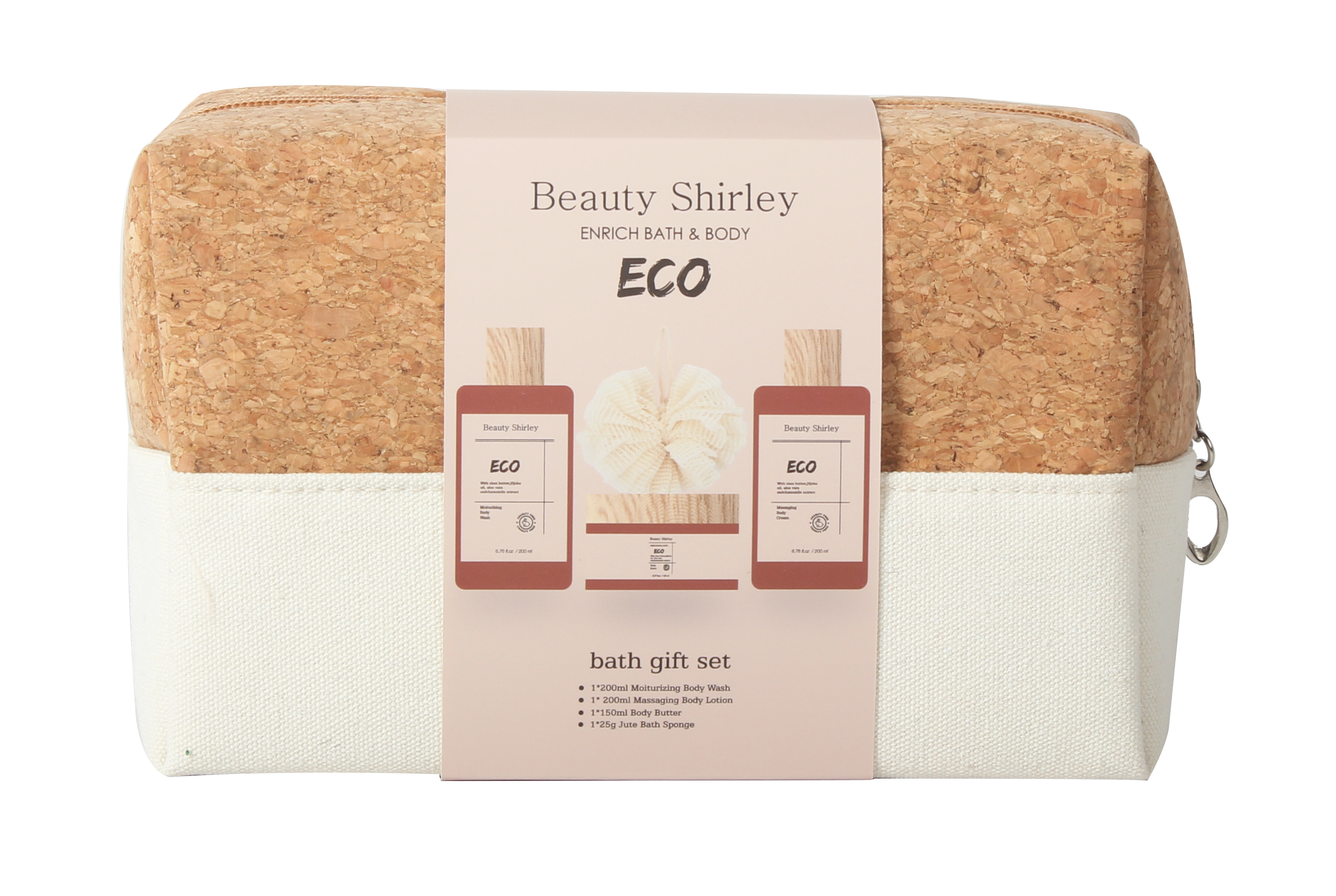 Contents | 200ml shower gel in plastic bottle + wood print cap, 200ml body lotion in plastic bottle + wood print cap, 100g body butter in jar + wood print cap, cork canvas cosmetic bag. |
