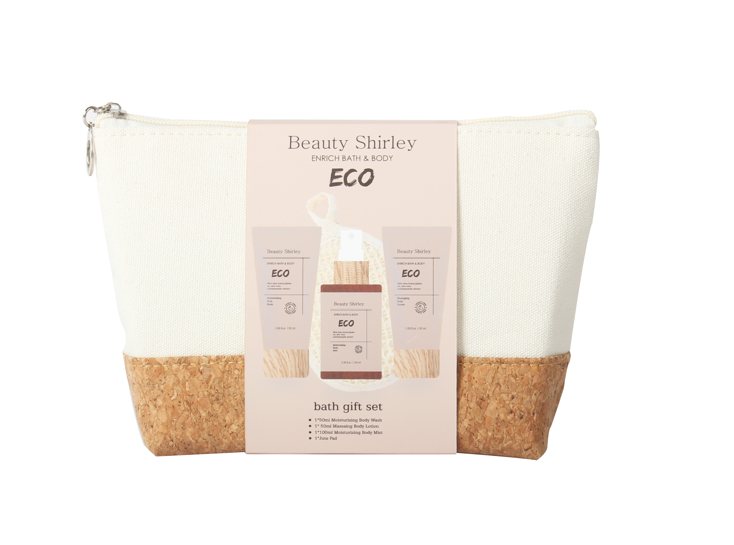 Contents | 50ml body wash in soft touch tube + wood print cap, 50ml body cream in soft touch tube + wood print cap, 100ml body mist in plastic bottle + wood print sprayer cap, two-sided linen/terry bath scrubber, cork canvas cosmetic bag, |