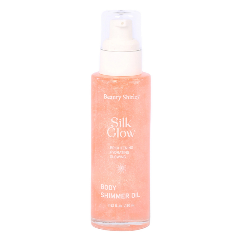 Contents | - 80ml Body Shimmer Oil - Rose pink - in glass bottle with white pump and cover |