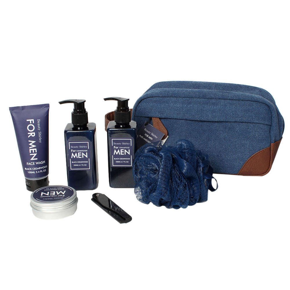 Contents | 200ml shampoo in glossy plastic bottle + matte cap +front & back label. 200ml condition in glossy plastic bottle +matte cap +front & back label. 100ml face wash in soft touch tube + matte flip cap + direct print, 50ml hair pomade in alumiliam jar + alumiliam lid + label, 30g mesh sponge, plastic beard comb, travel bag + hangtag. |
