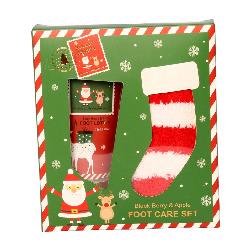 Contents | 75 ml foot lotion in tube + gold cap, a pair of plush foot sock, paper box + PET tray. |