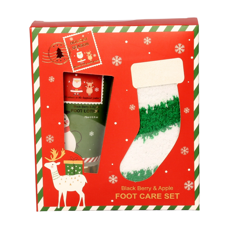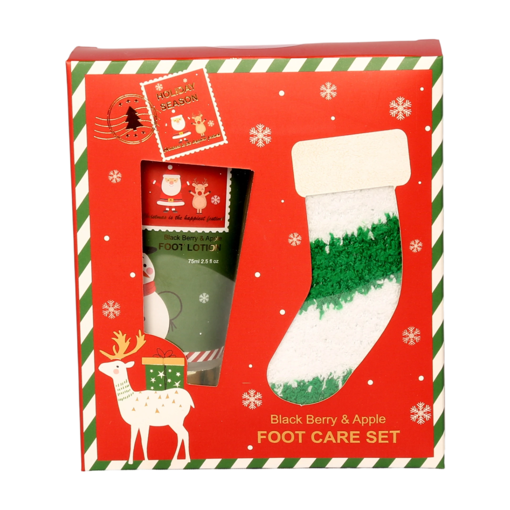 Contents | 75 ml foot lotion in tube + gold cap, a pair of plush foot sock, paper box + PET tray. |