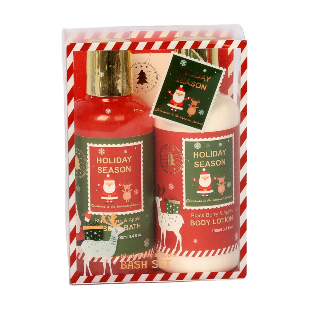 Contents | 100ml body lotion in plastic bottle + gold cap, 100ml bubble bath in plastic bottle + gold cap, PET box + paper back card. |
