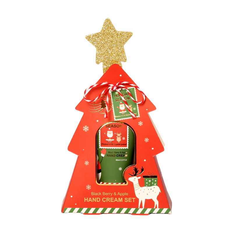 Contents | 60ml hand cream in plastic aluminum tube + gold cap, printed nail file, paper box + PET tray + ribbon |