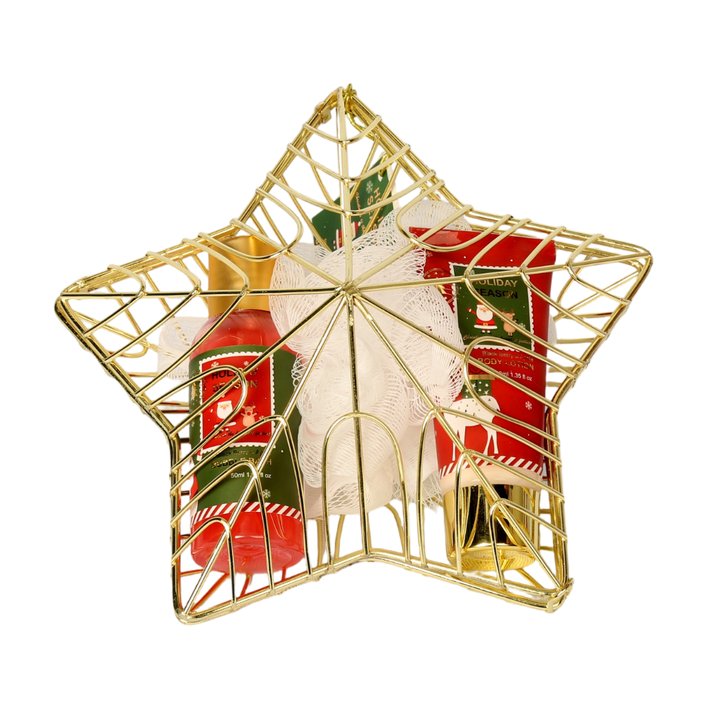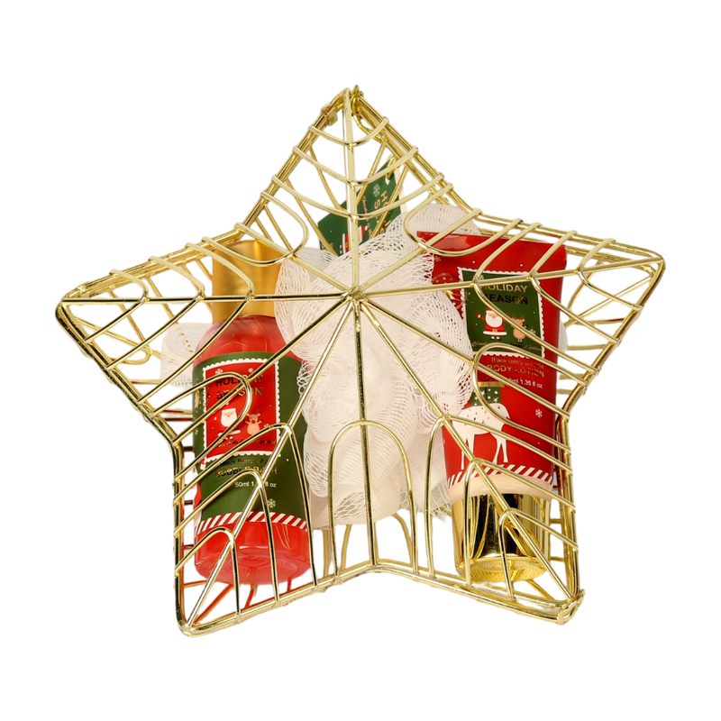 Contents | 50ml bubble bath in plastic bottle + gold cap, 40ml body lotion in tube + gold cap, 15g mesh sponge, golden wire basket + hang tag shrink packaging |
