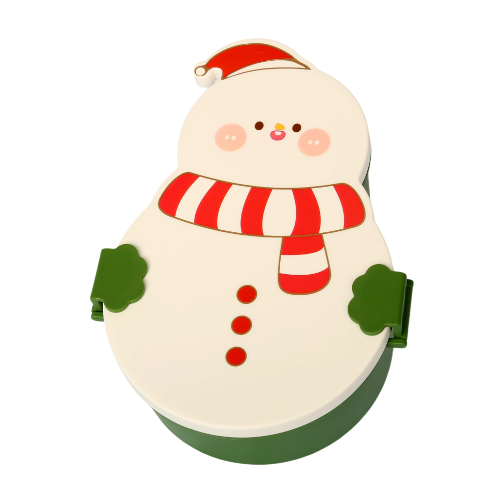 The snowman-shaped lunch box with included utensils creates immediate visual impact and reusable value, transforming the product into a memorable holiday gift that stands out in competitive seasonal displays.