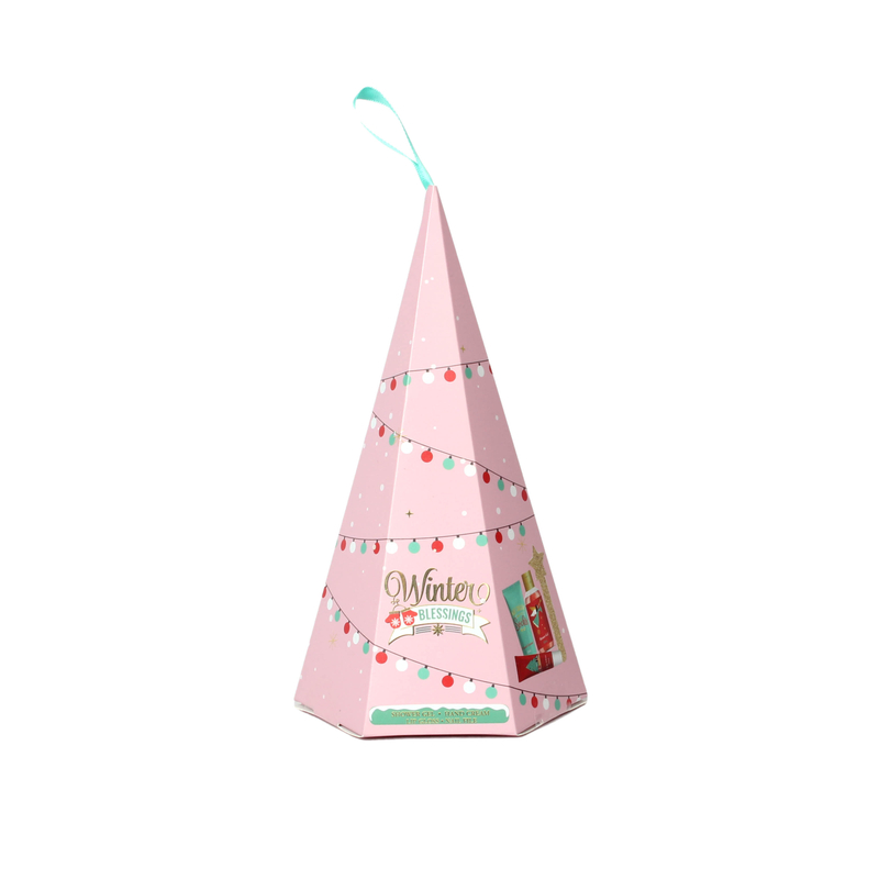 Contents | 75ml Shower Gel in bottle + plastic cap, 30ml Hand Cream in tube + plastic cap, 10ml Lip Gloss in tube + plastic cap Glitter Nail File, Paper Box + Ribbon. |