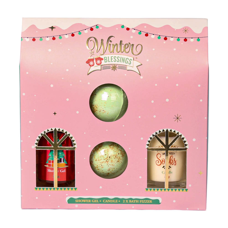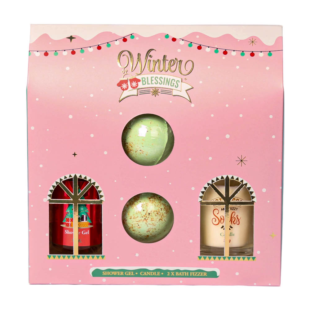 Contents | 75ml Shower Gel in bottle + plastic cap, 60g Bath Bomb, 50g Candle in glass bottle, Paper Box + PET tray. |